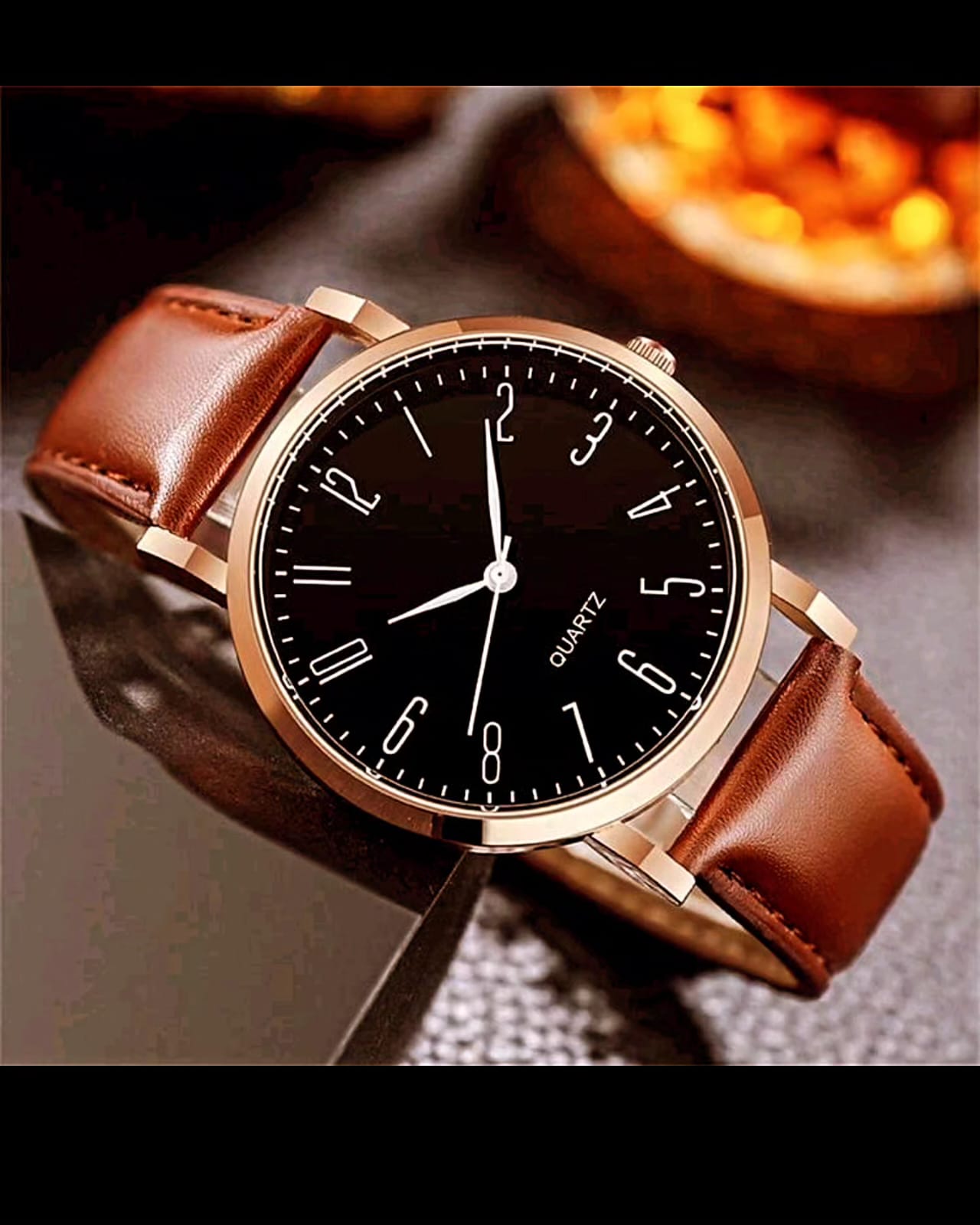 Reloj analógico para caballero color marrón, espera dorada y fondo negro, malla eco cuero con hebilla para estilo sport elegante. viene en caja especial para regalo. Pila incluido.